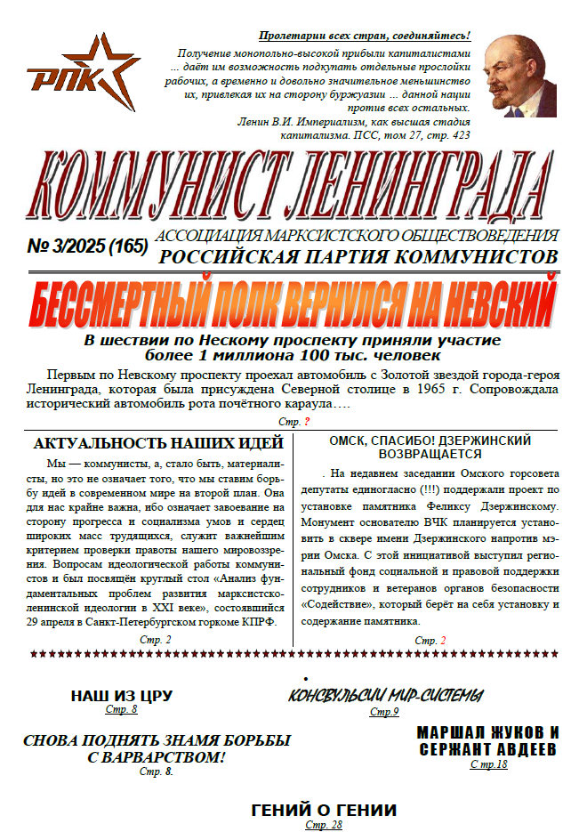 We are publishing here issue No.3 for the year 2025 (Issue No. 165) of Communist of Leningrad, the bi-monthly publication of the Russian Party of Communists in Leningrad (St. Petersburg).